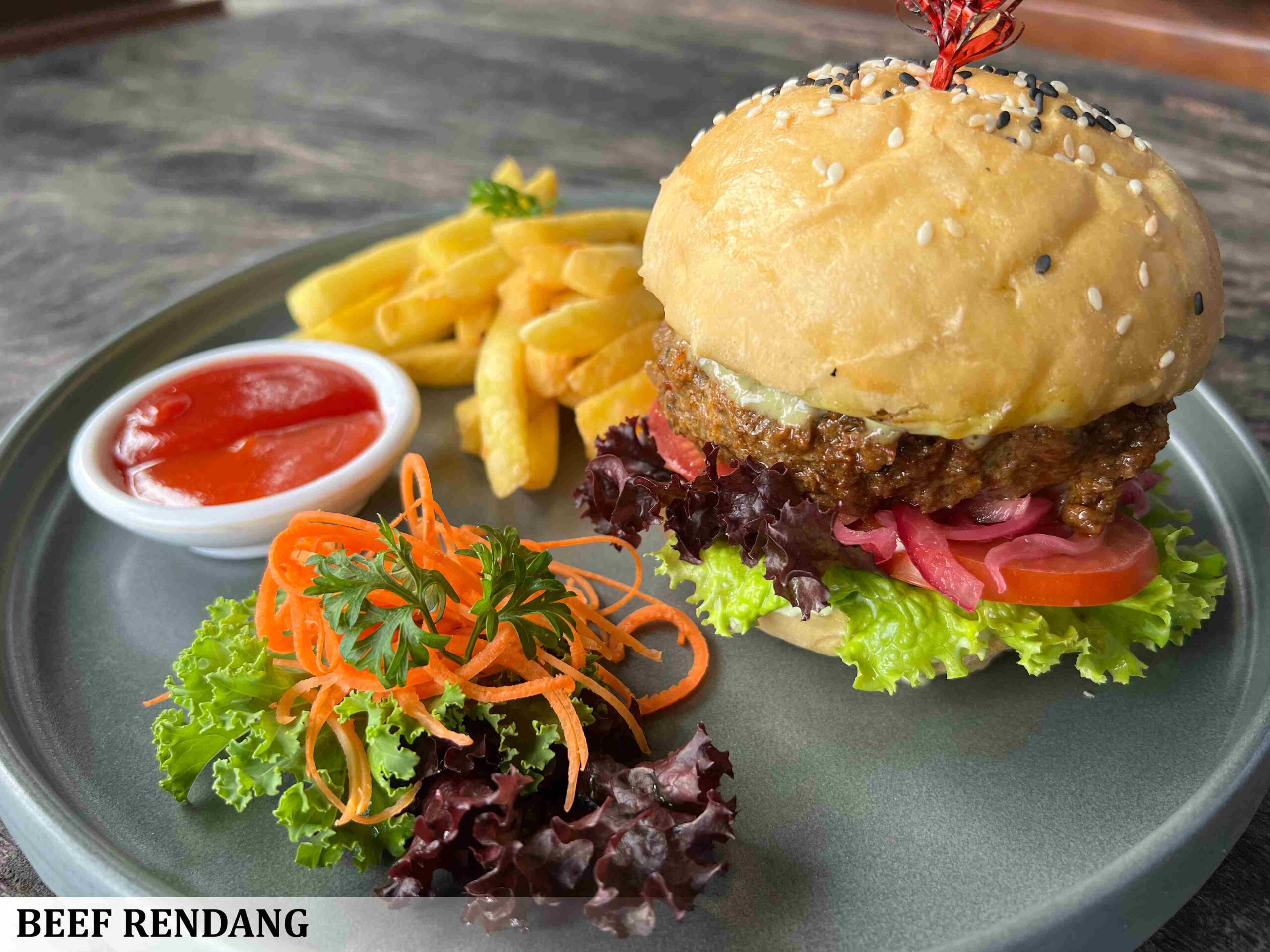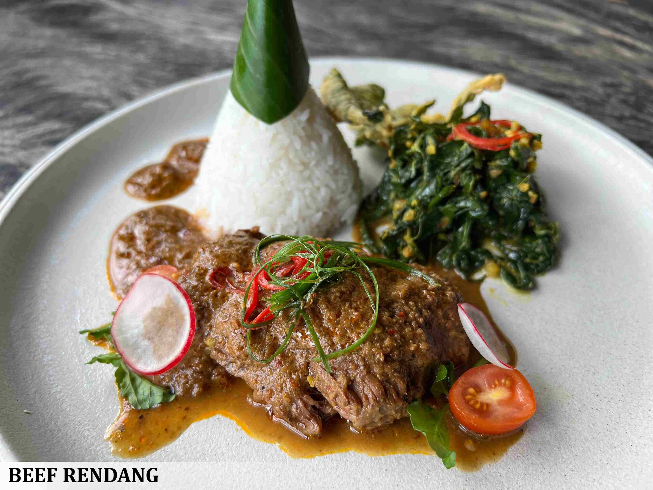 Braised beef stew with Indonesian spices, onion relish, tomato, lettuce