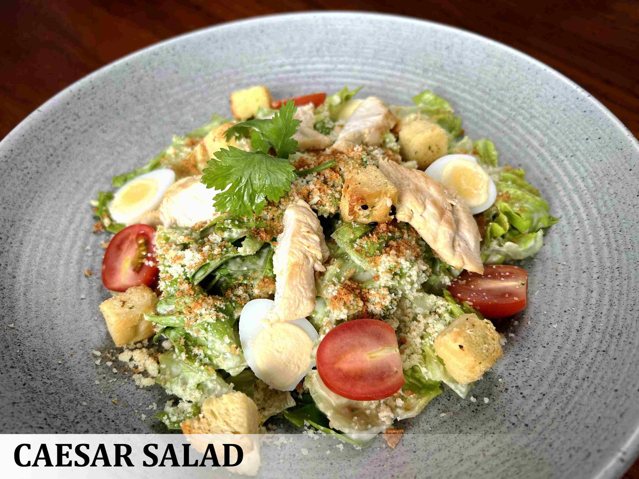 Romaine lettuce, quail egg, chicken bacon, crouton and Caesar dressing
