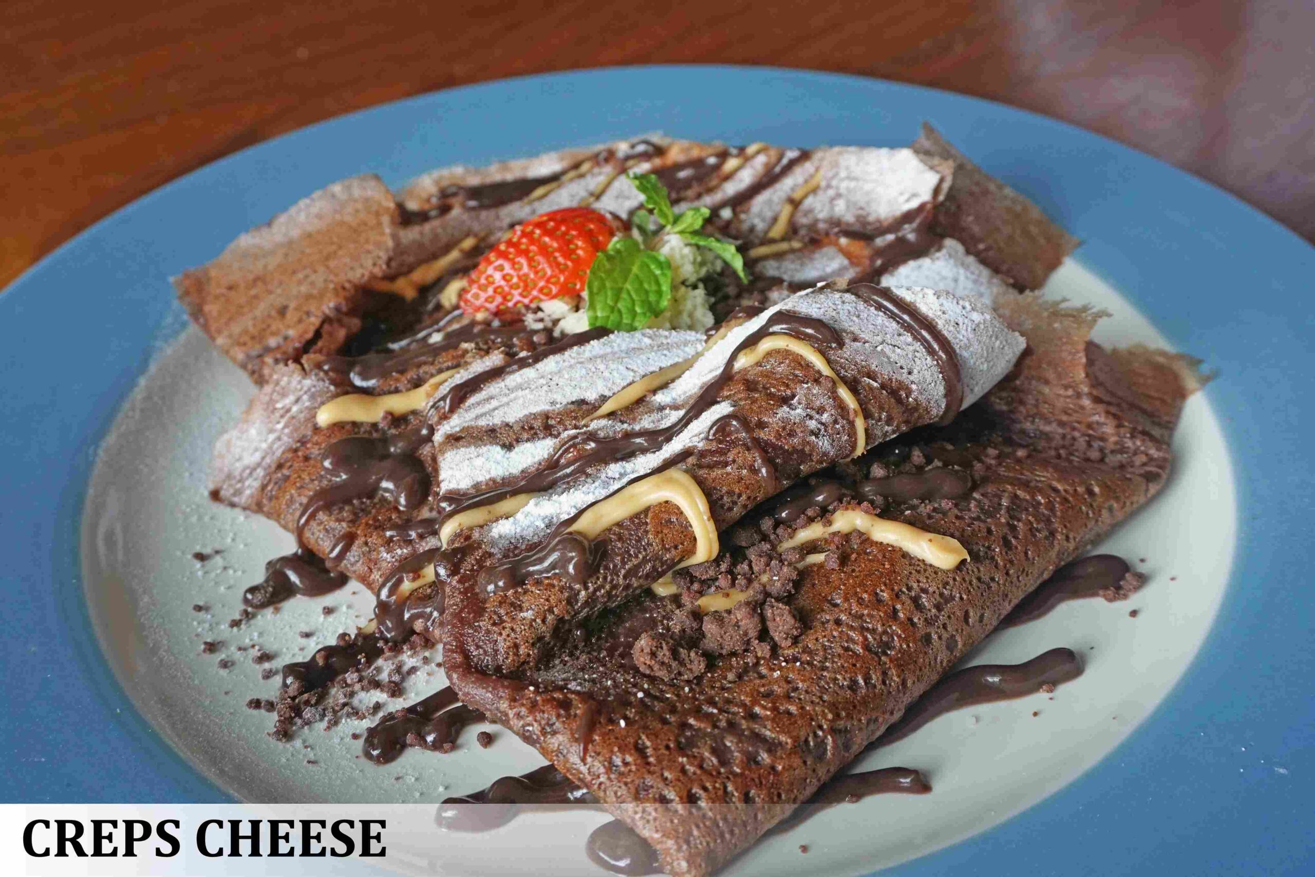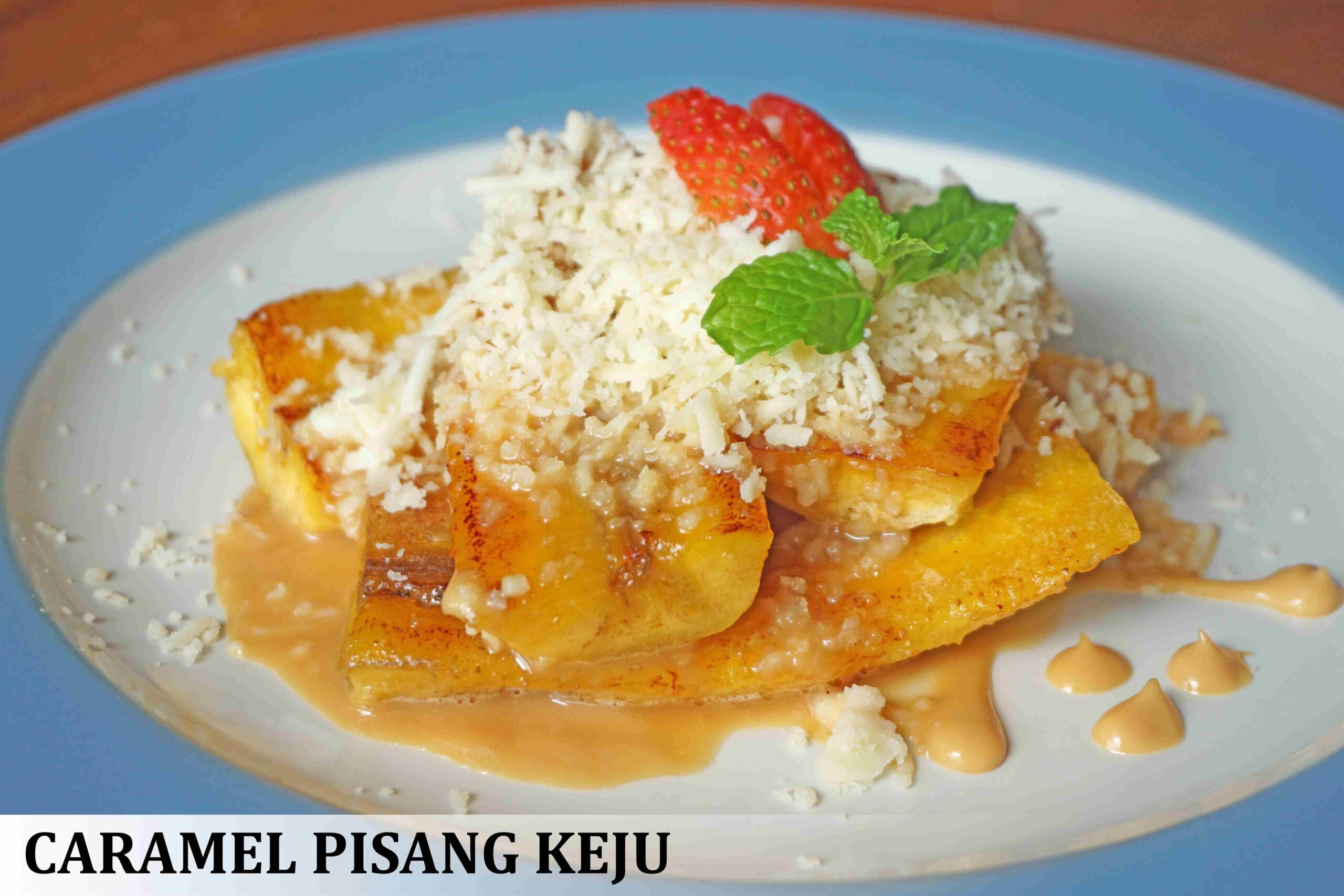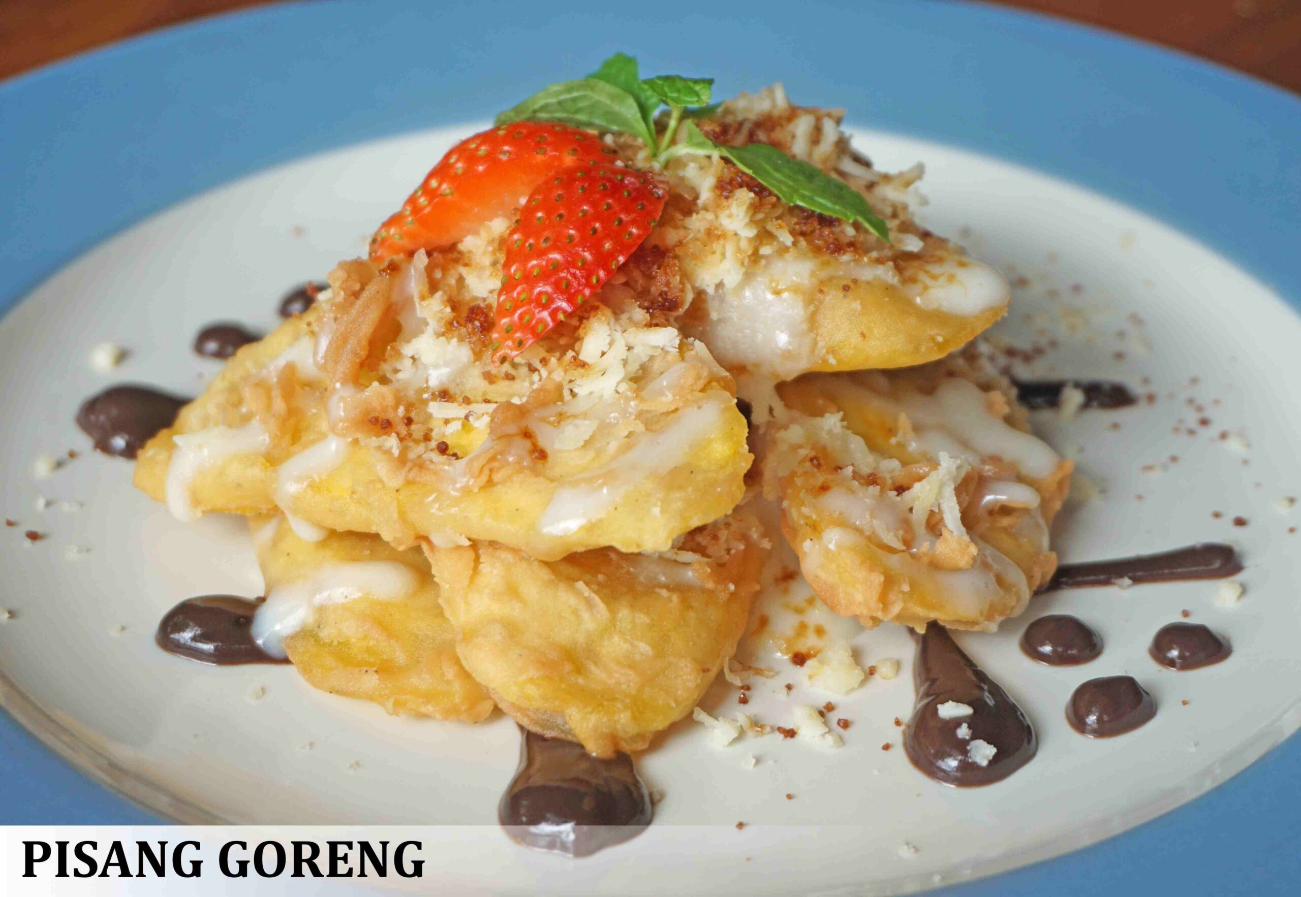 Pisang goreng yang disajikan dengan keju, vanila dan saus coklat