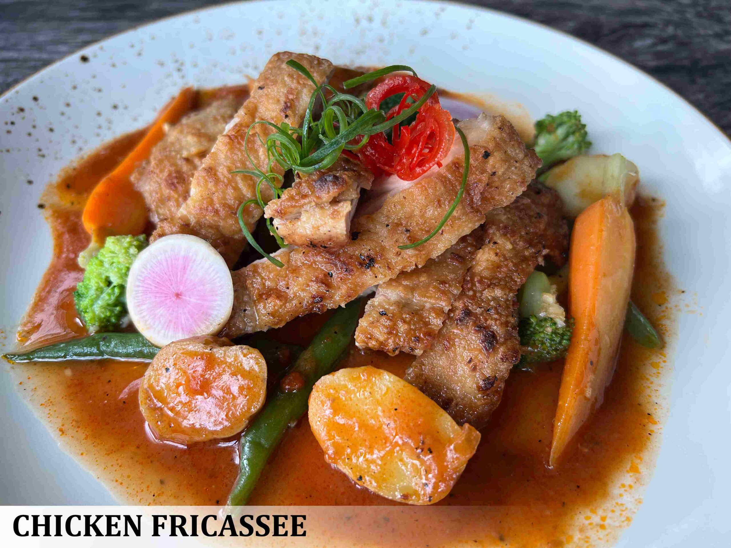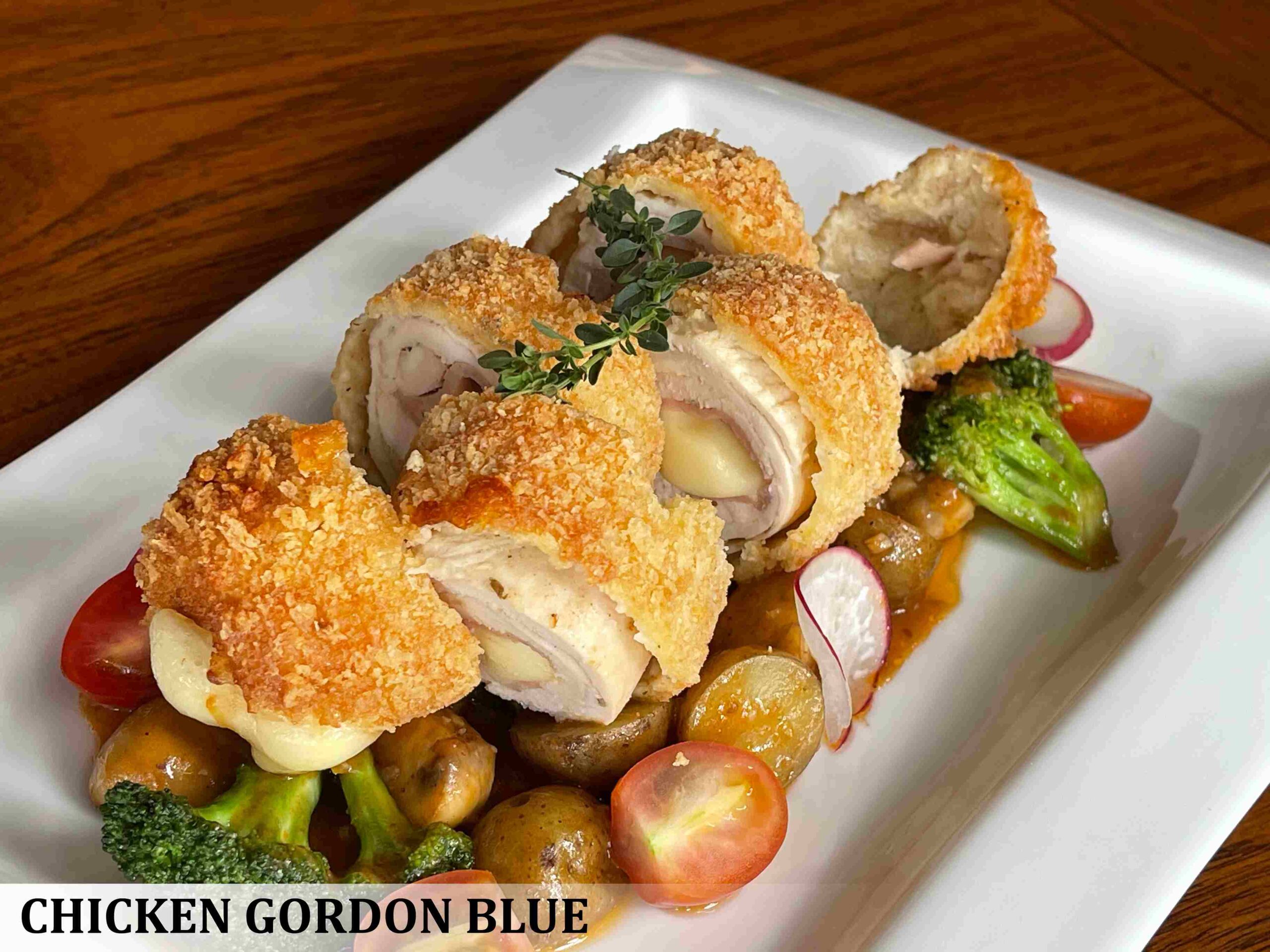 Ayam goreng dengan isian bakon ayam, keju mozzarella, disajkan dengan sayur