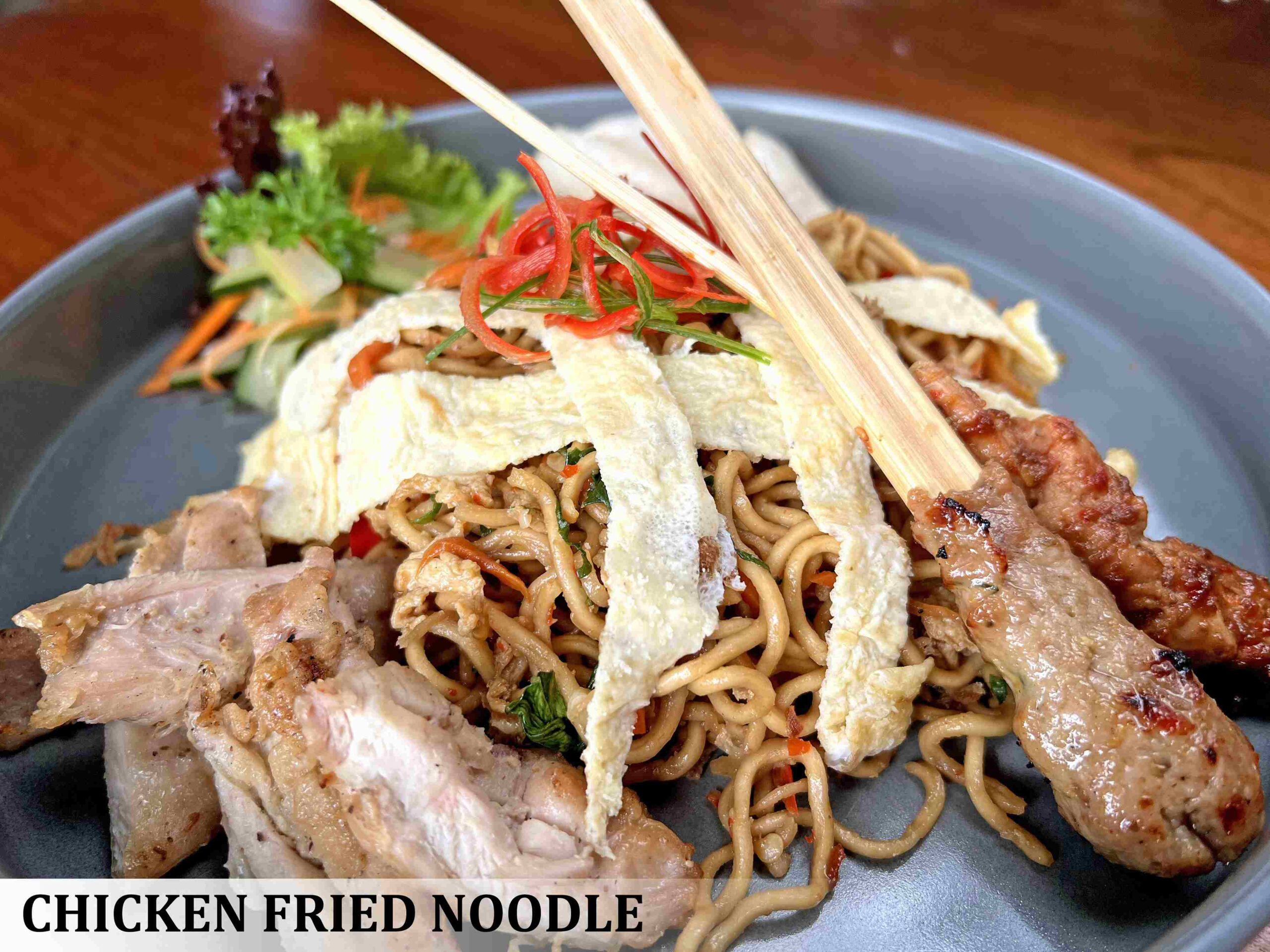 Indonesian style fried noodle served with grilled chicken, skewer, shrimp crackers, fried egg, and homemade pickle