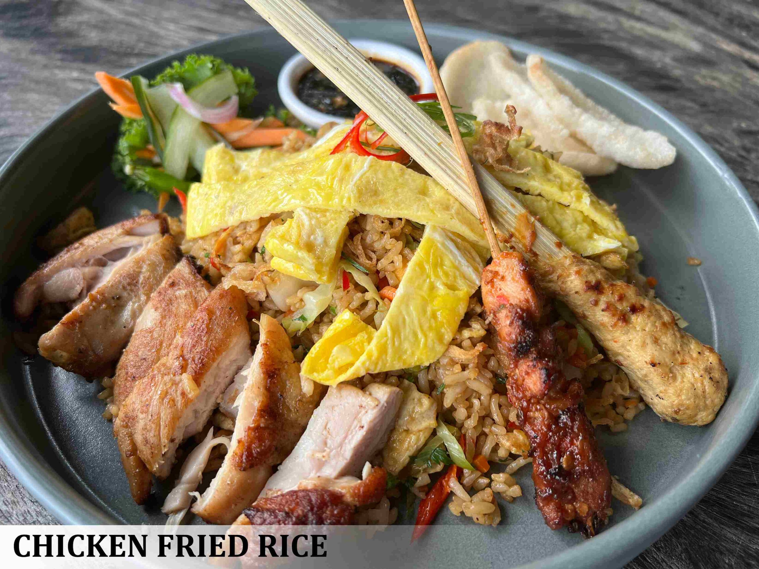 Indonesian style fried rice served with grilled chicken, skewer, shrimp crackers, fried egg, and homemade pickle