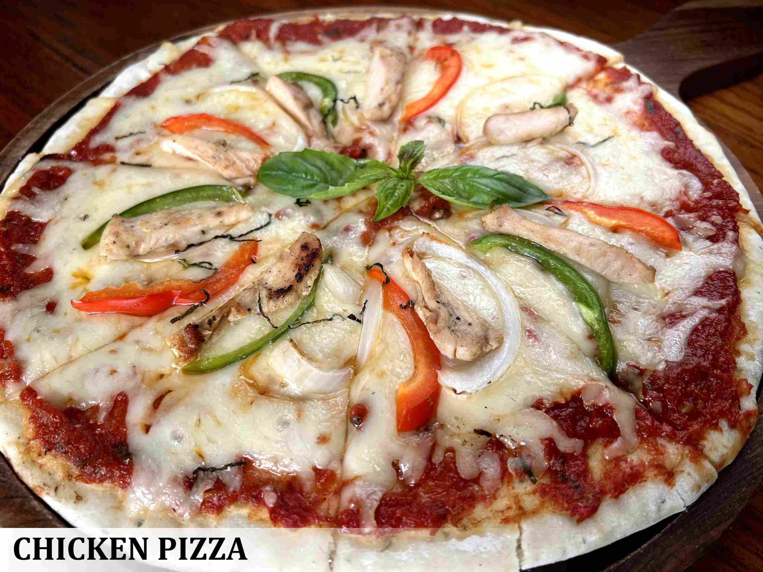 Tomato concasse, roasted chicken, mix capsicum, onion, basil, and cheese