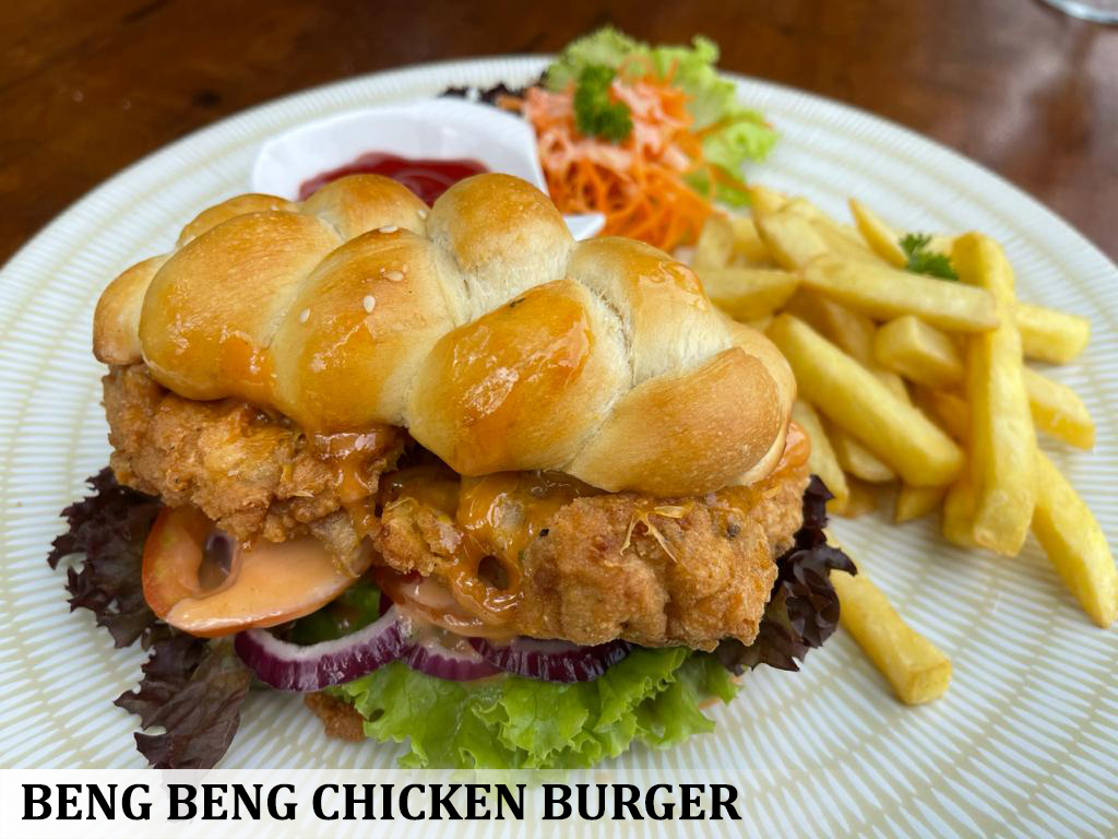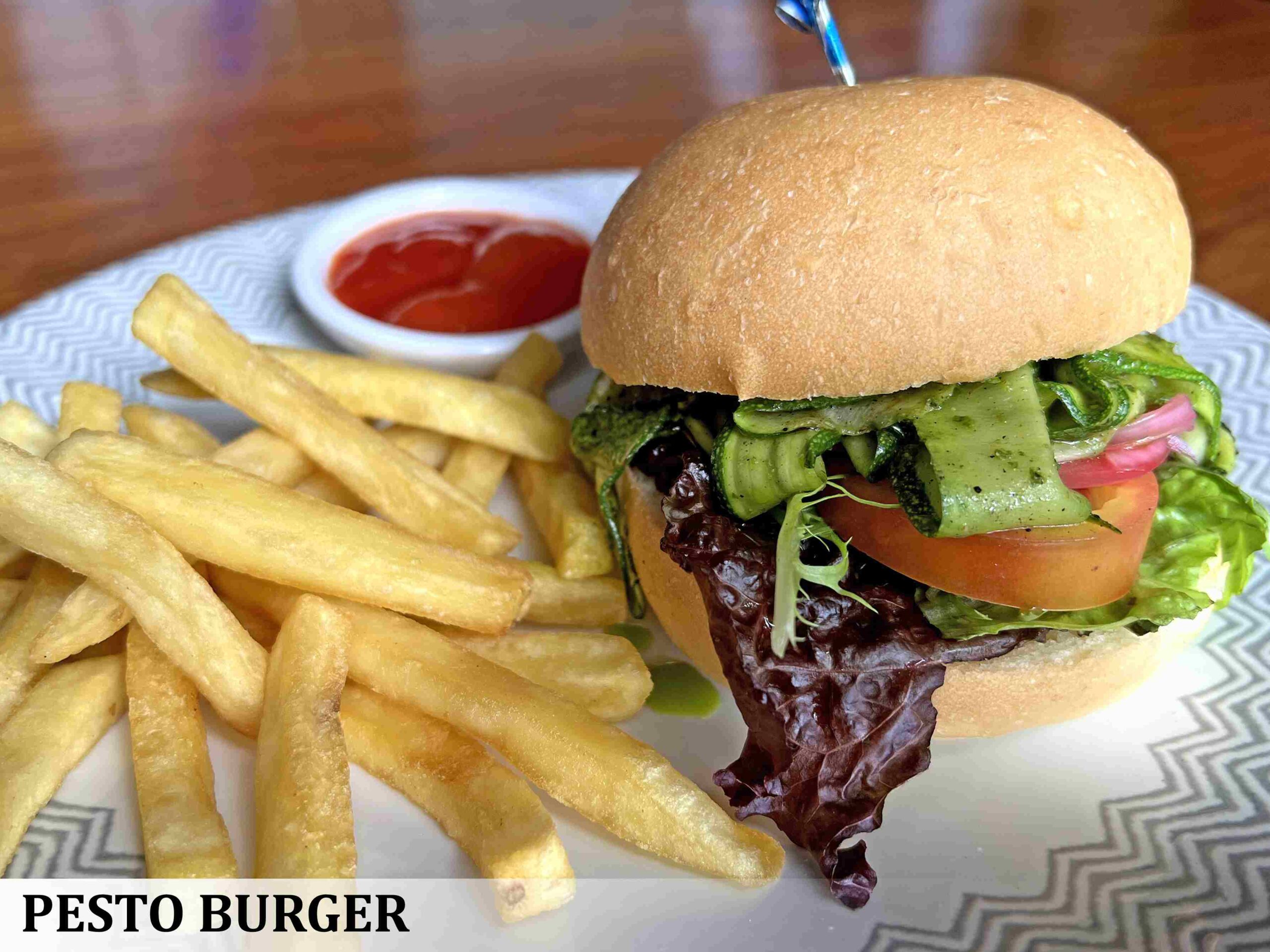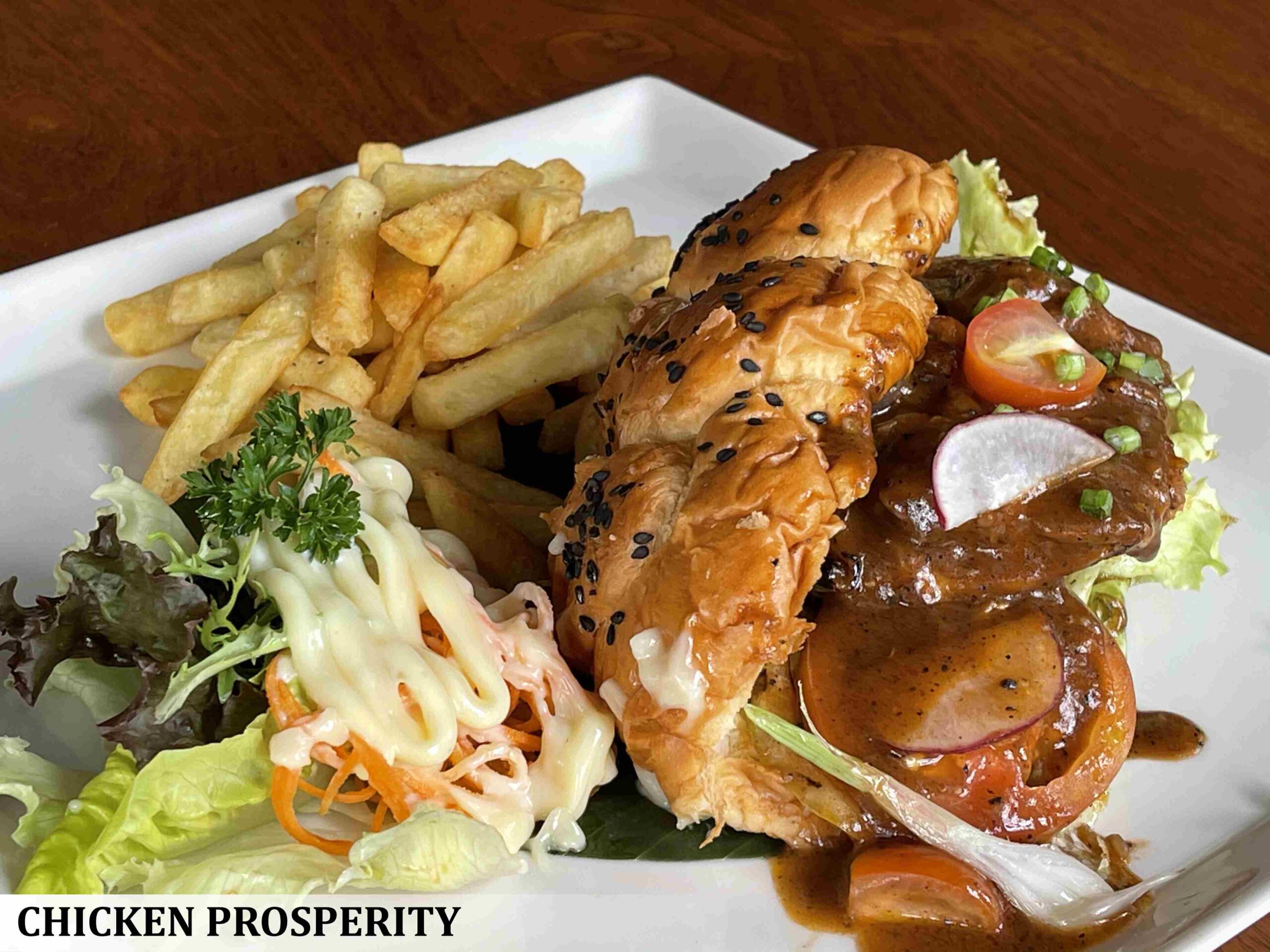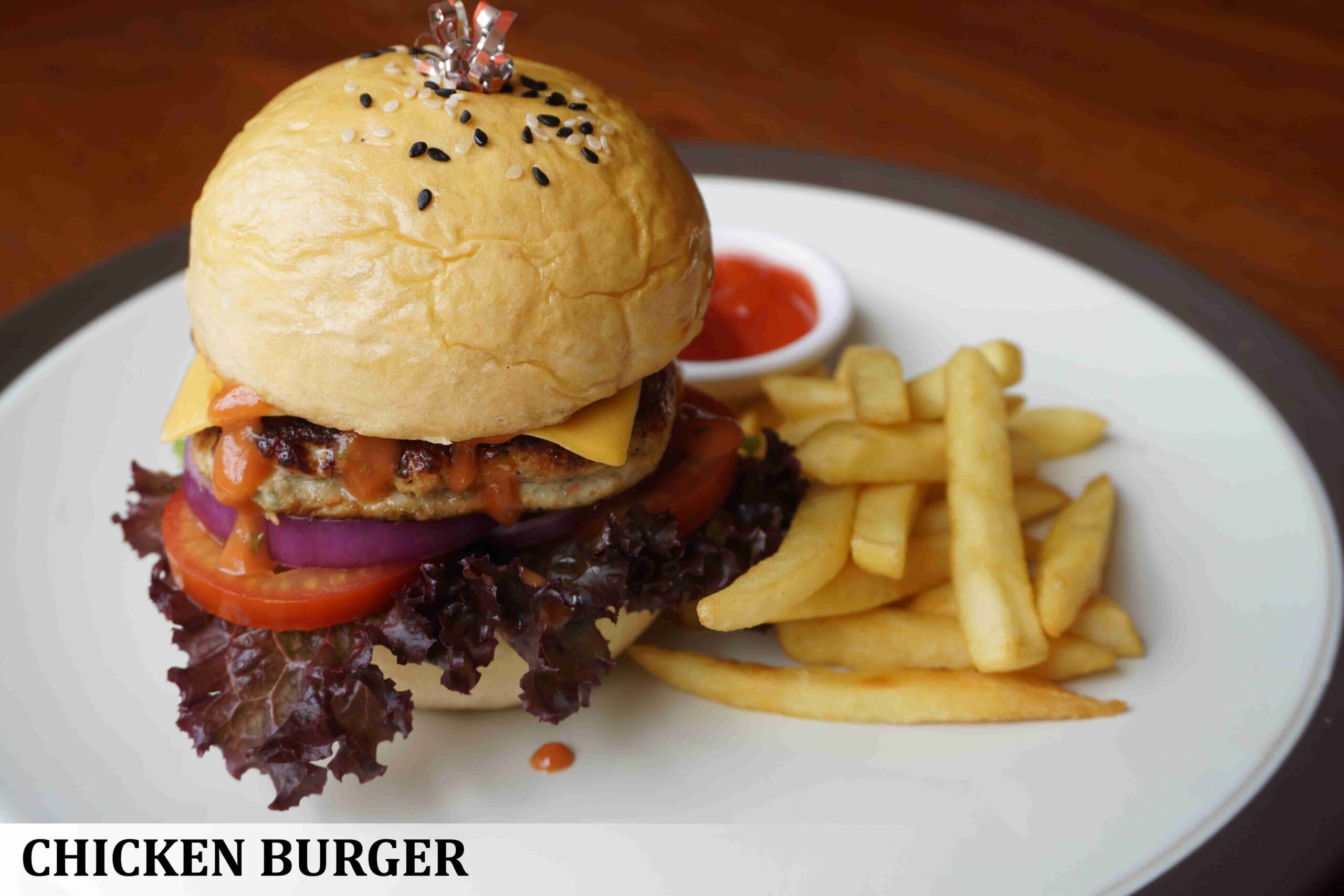 Homemade bun, minced chicken patty, tomato, onion relish, lettuce, cheese