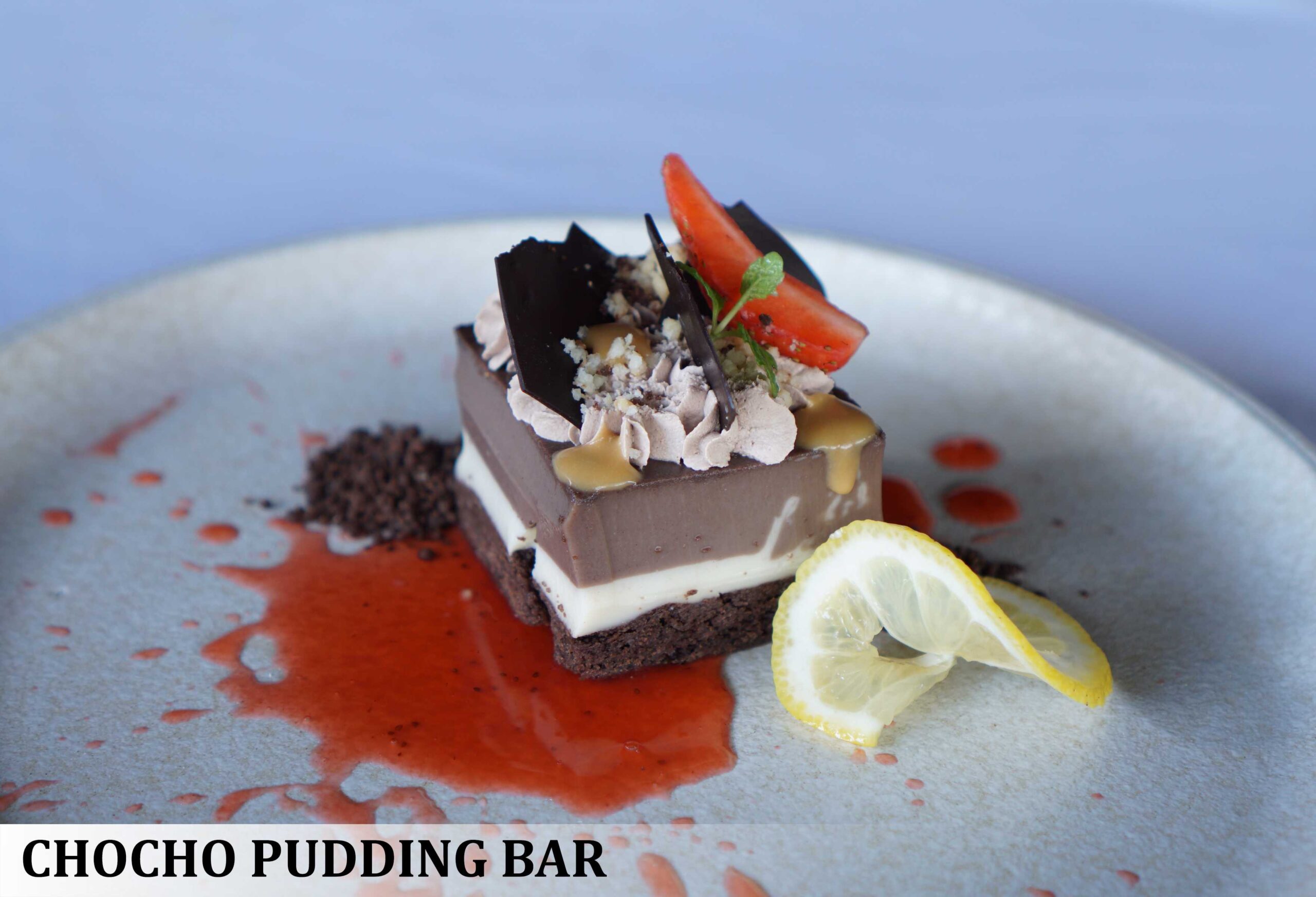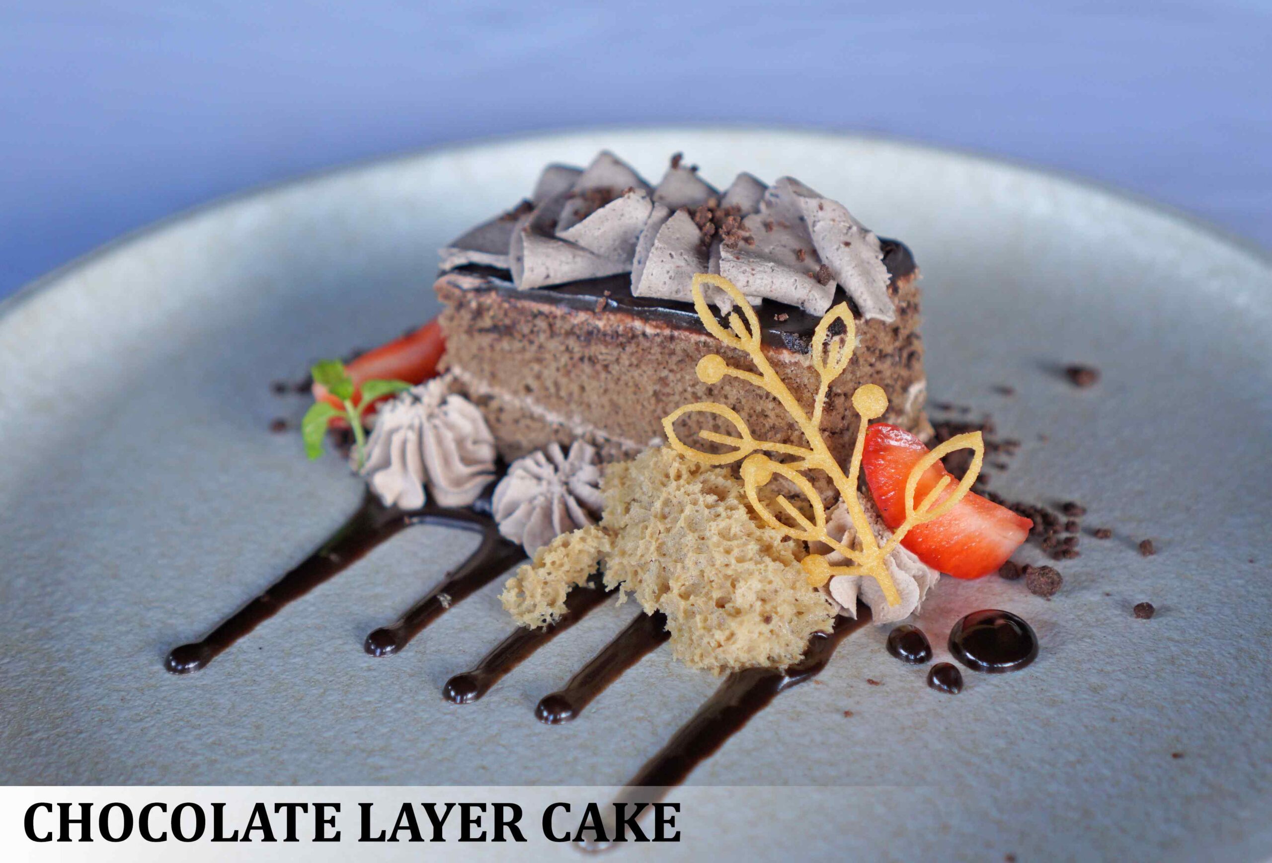 Kue coklat disajikan dengan saus coklat, crumble dan krim