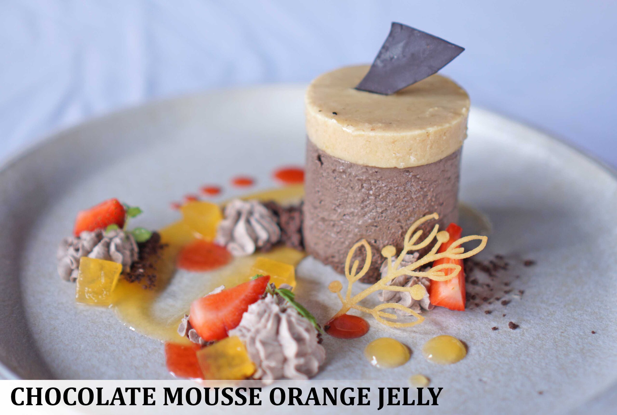 Chocolate mousse and orange jelly served with orange sauce Nand chocolate cream