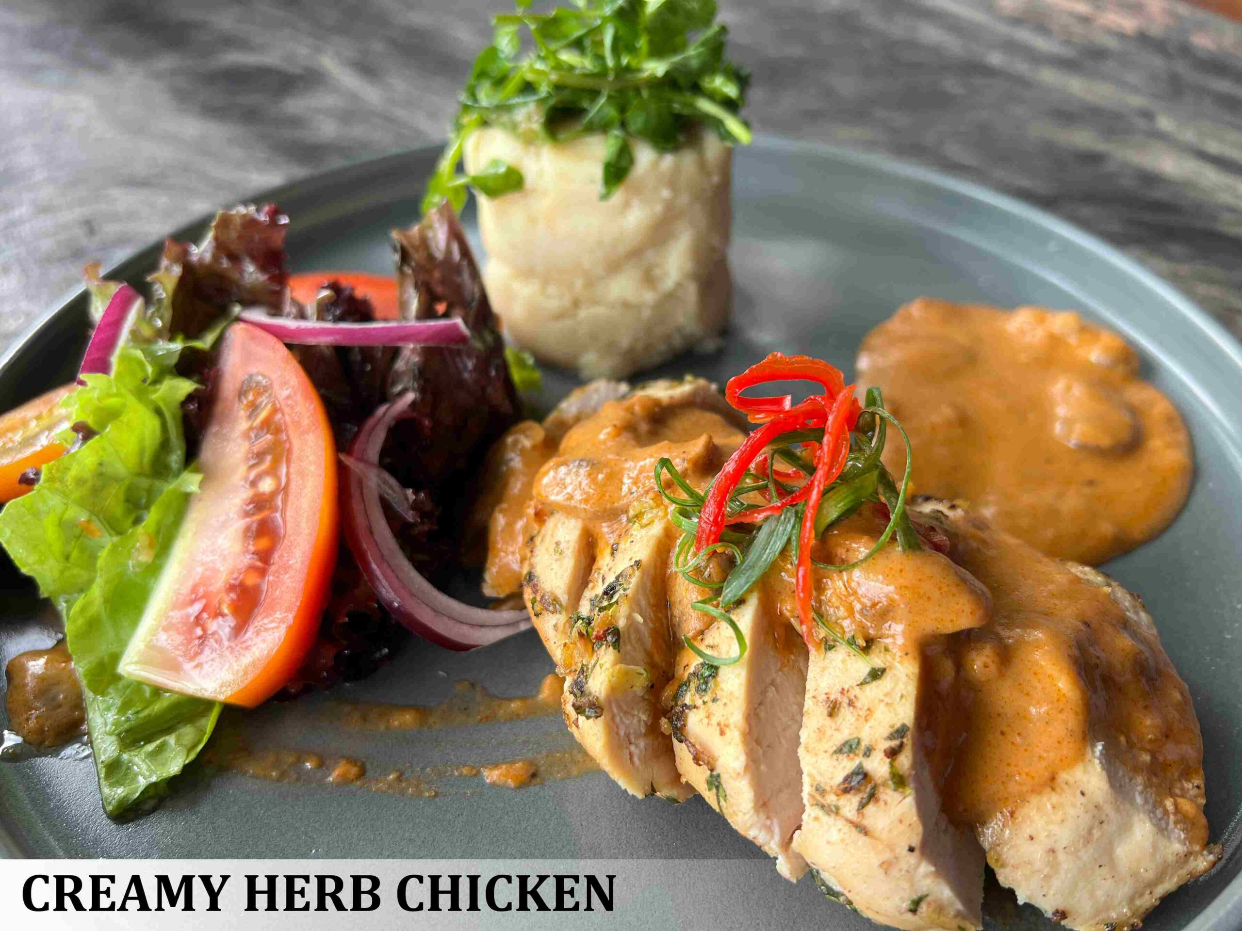 Pan seared chicken breast with creamy herb sauce, and vegetable