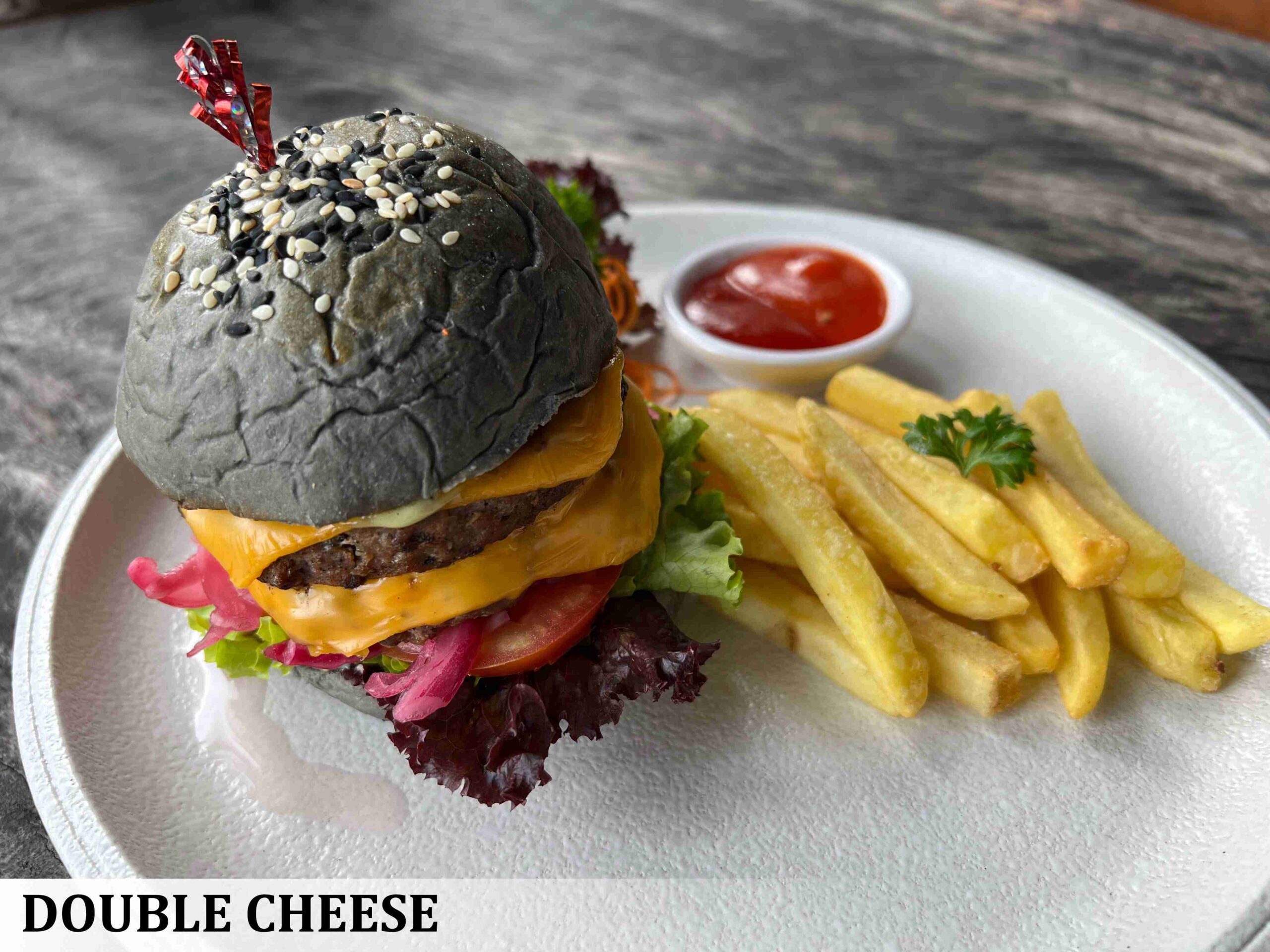 Homemade black bun, double beef patty, double cheese, lettuce, tomato, onion relish
