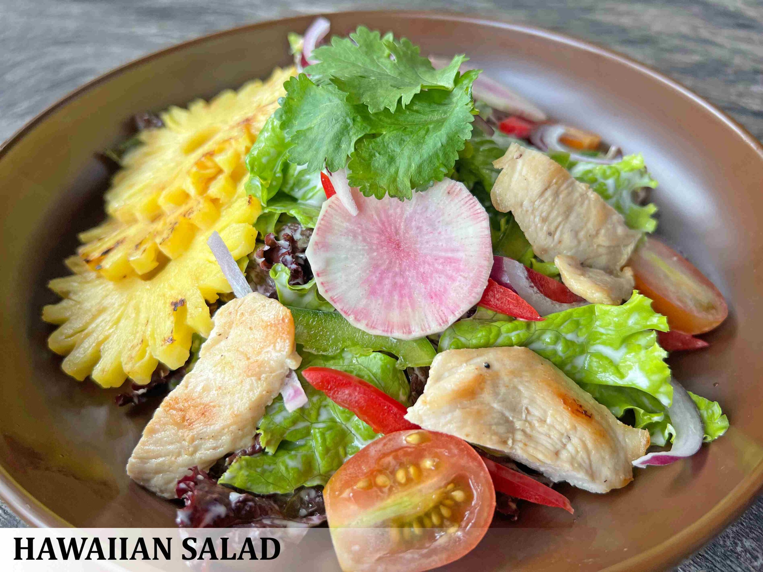 Mix lettuce, slice pineapple, tomato, cucumber, mix capsicum and dressing