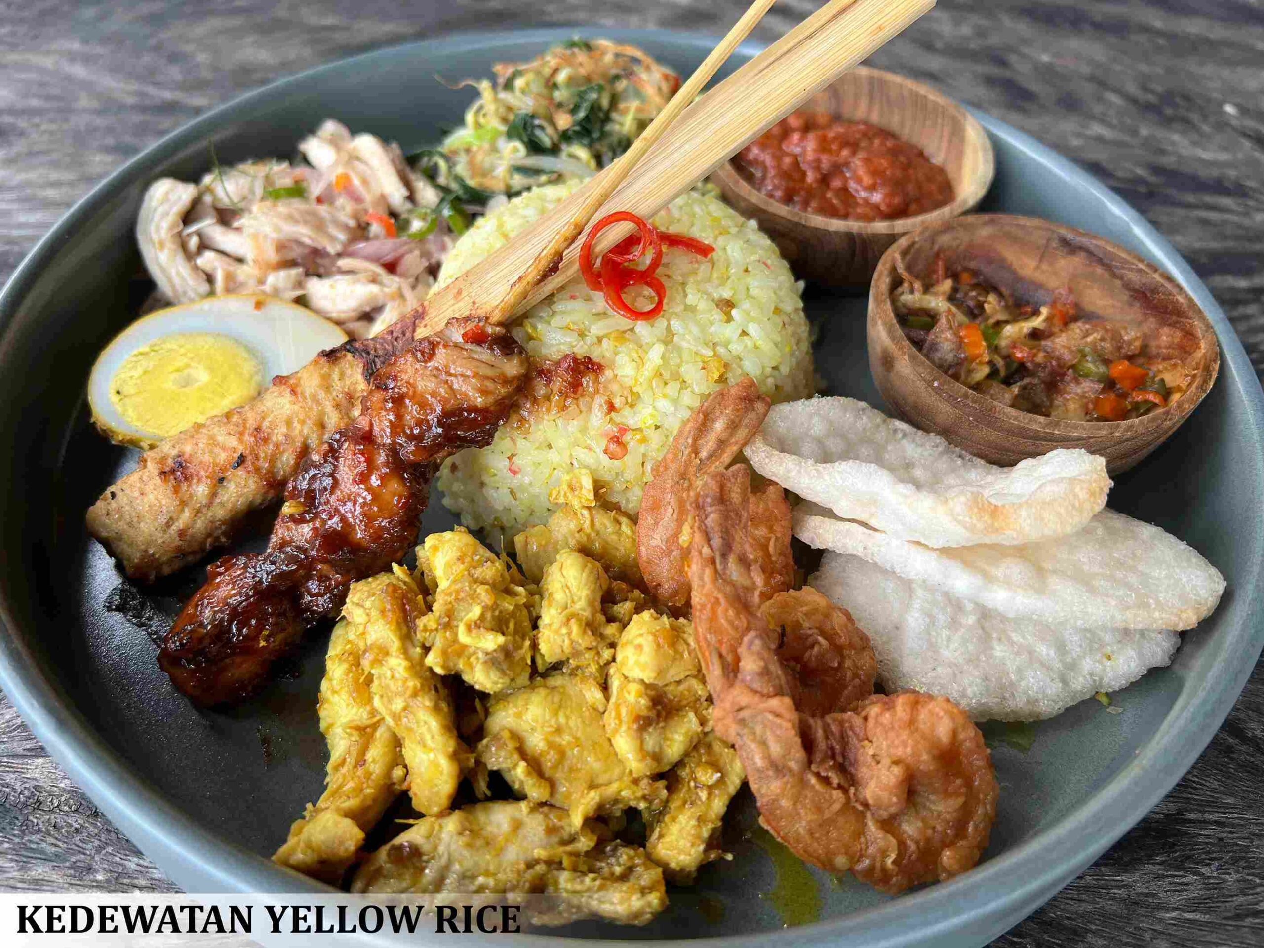 Nasi dengan bumbu kuning disajikan dengan telur, ayam sambal matah, ayam betutu, sate, udang tempura, kacang goreng, sambal embe, kecombrang dan krupuk udang