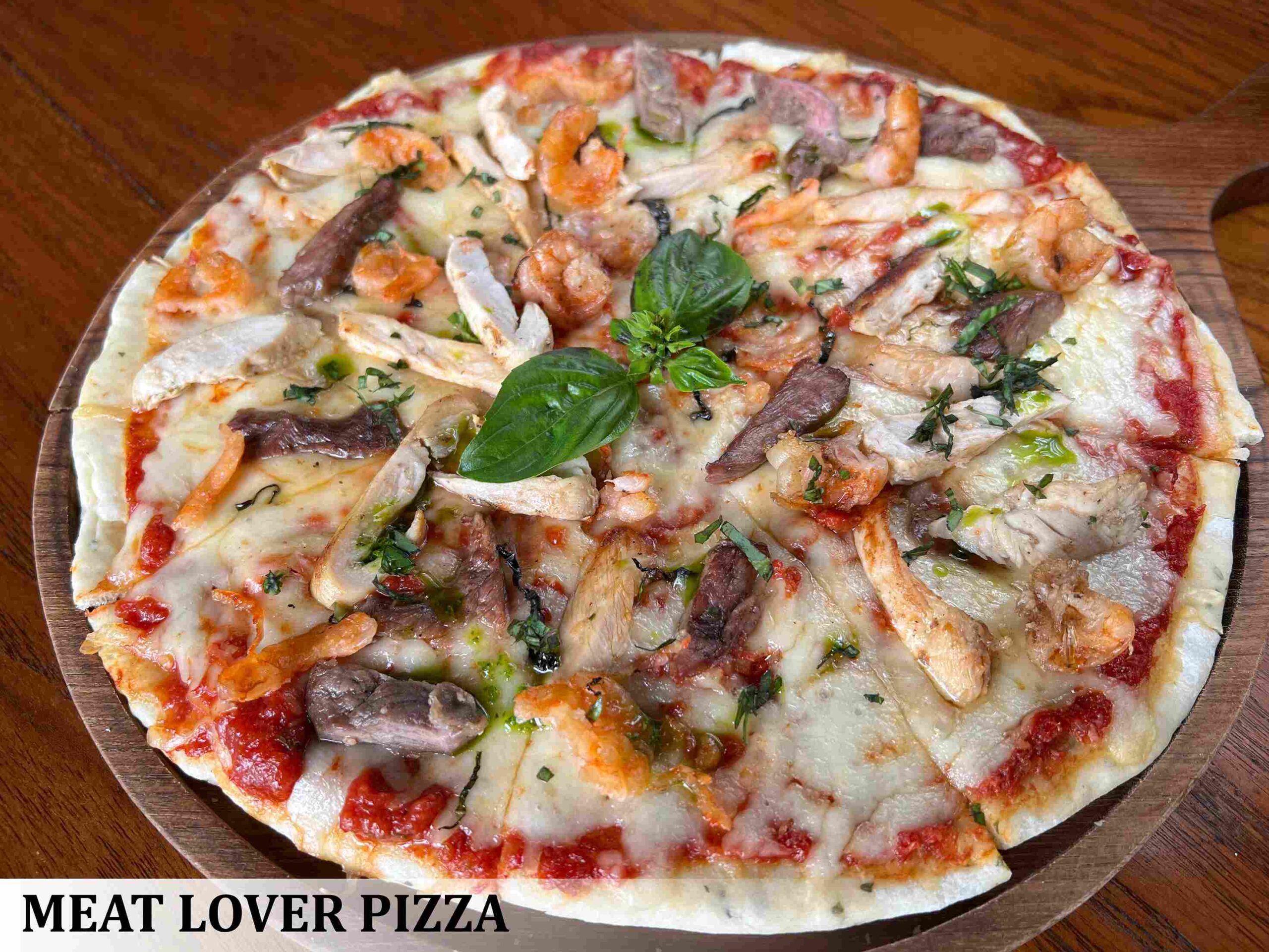 Tomato concasse, cheese, chicken, beef, prawn, basil