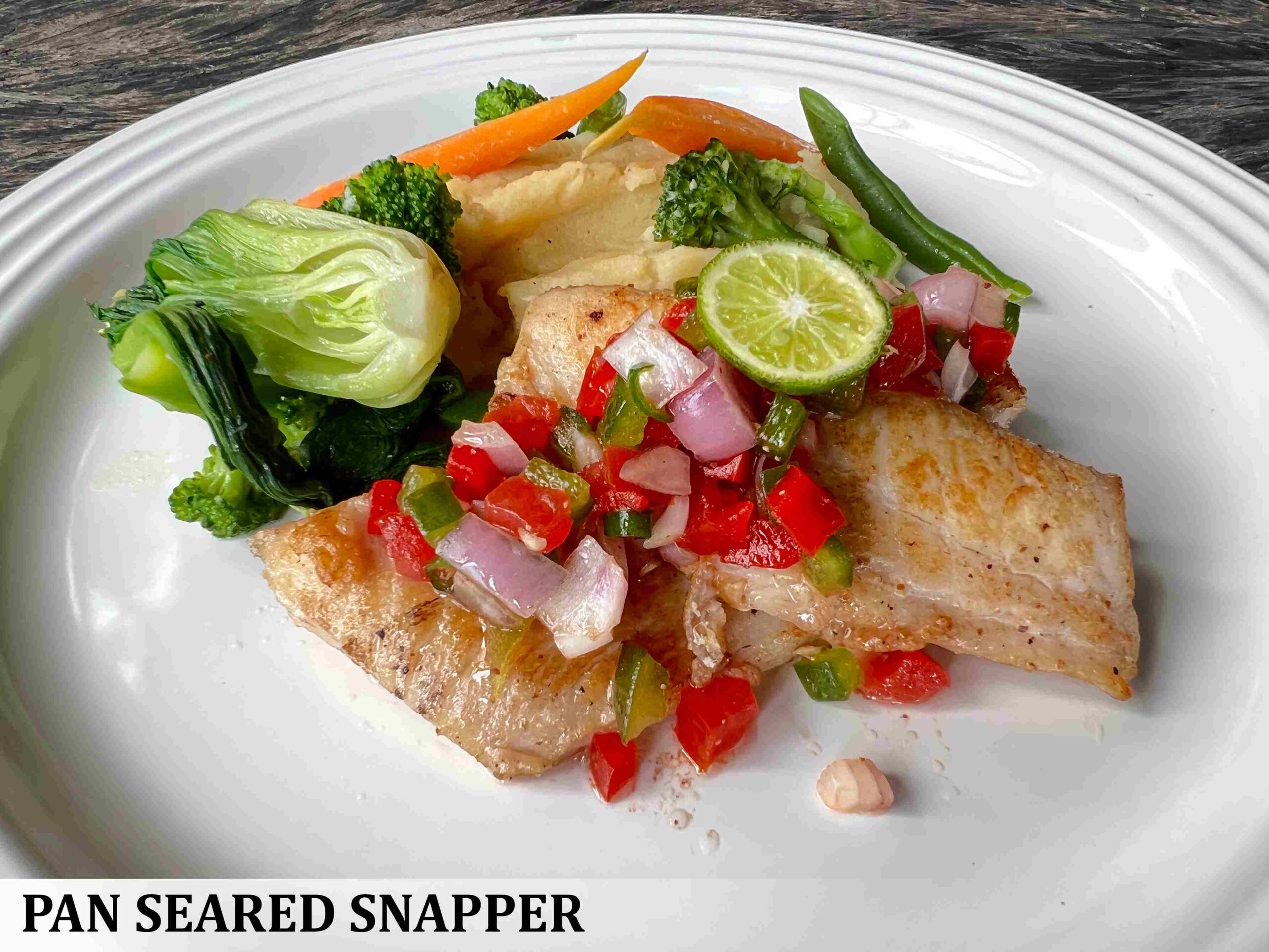 Pan seared snapper fish with dabu – dabu sauce, baby carrot, vegetable