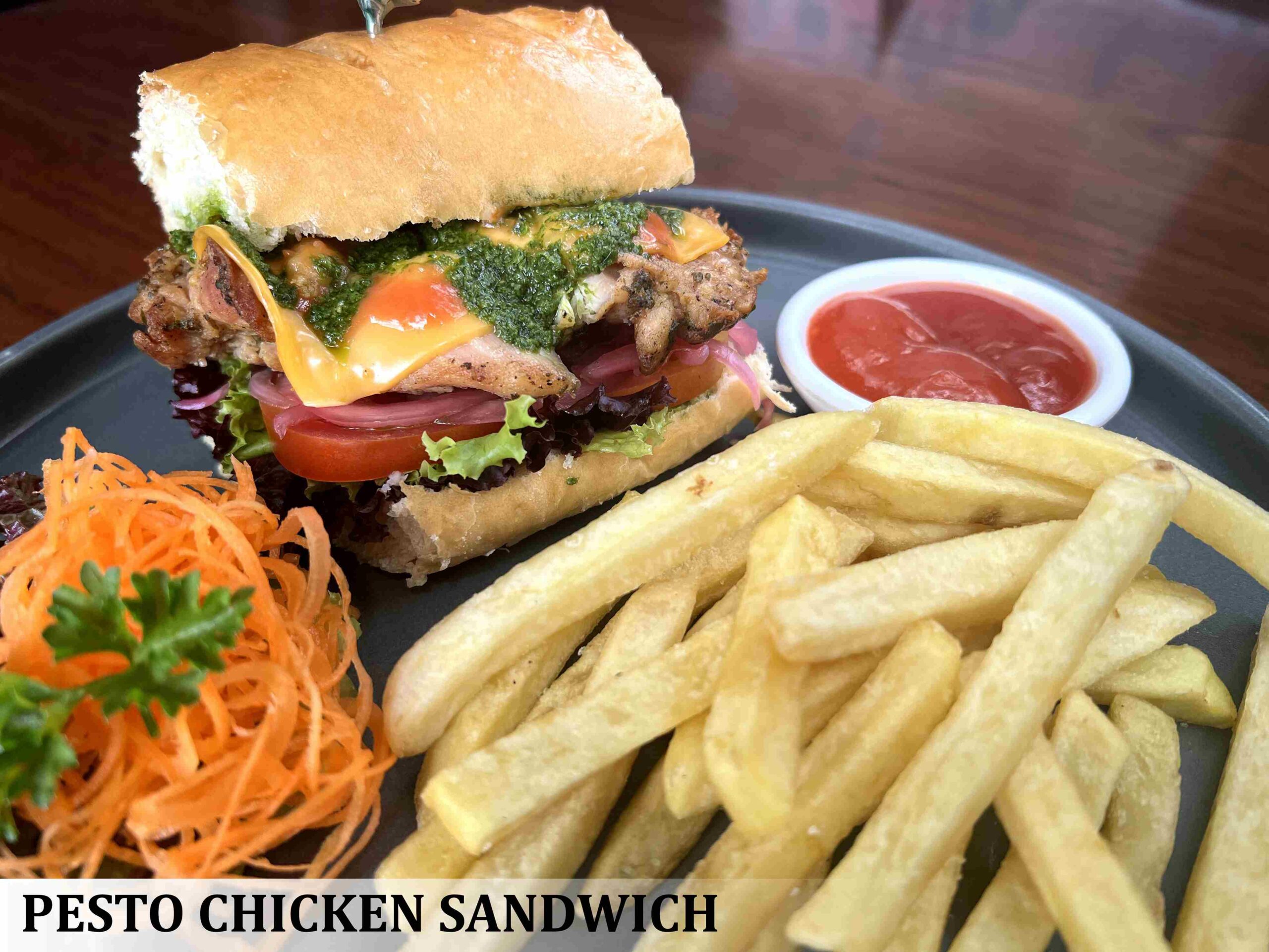 Homemade bun, crispy chicken with cheese on top, lettuce, tomato, onion relish