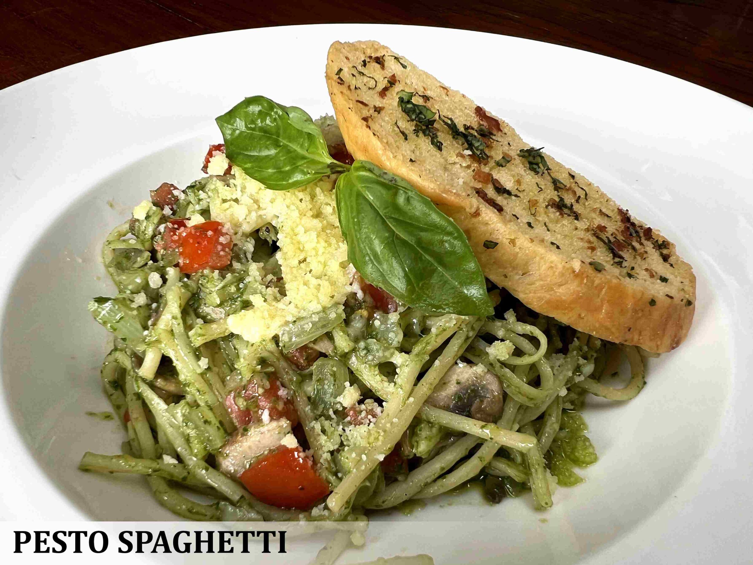 Onion, mushroom, tomato, herb pesto sauce, and cheese