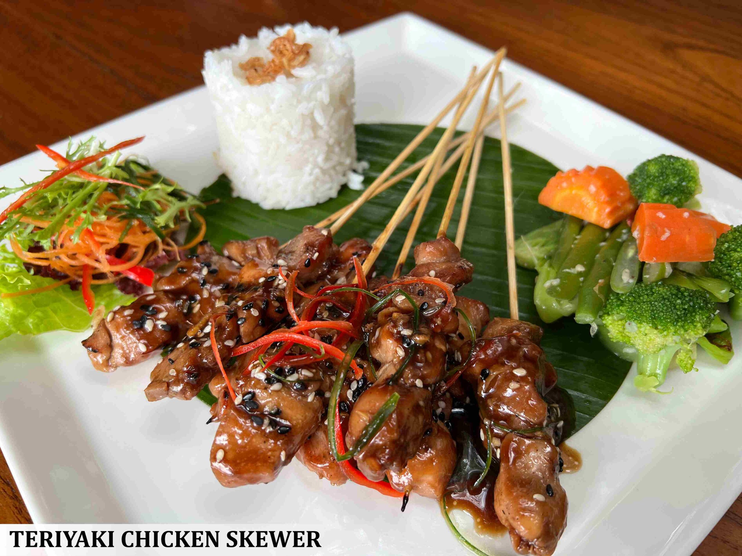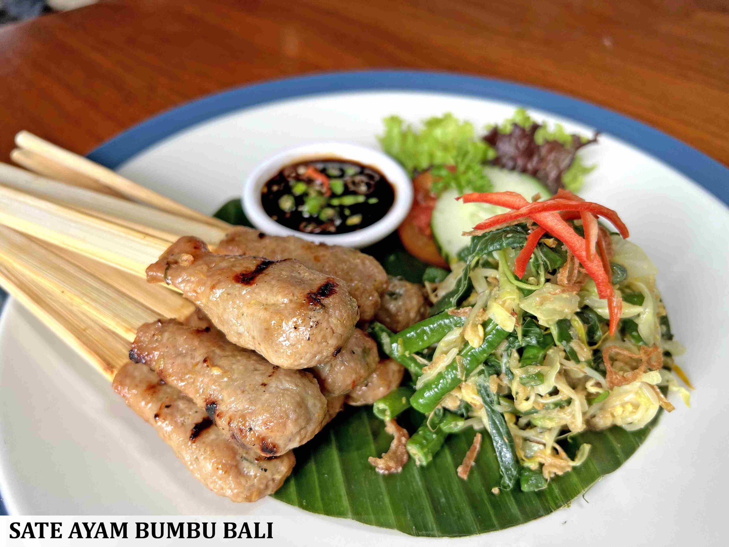 Grilled marinated chicken satay, Balinese mix vegetable, and chili soya
