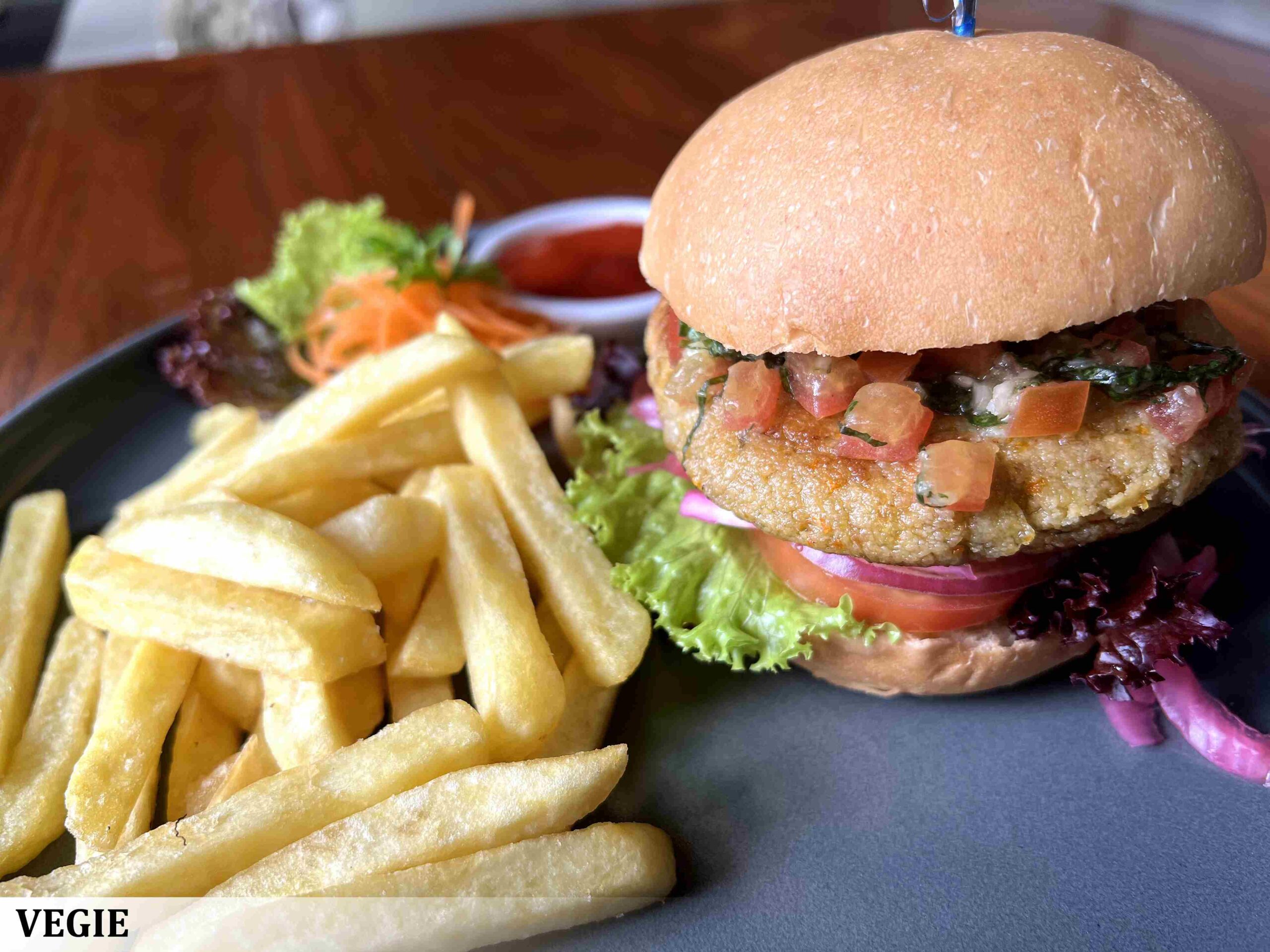 Homemade vegie bun, vegetable patty, tomato salsa on top, slice tomato, onion relish