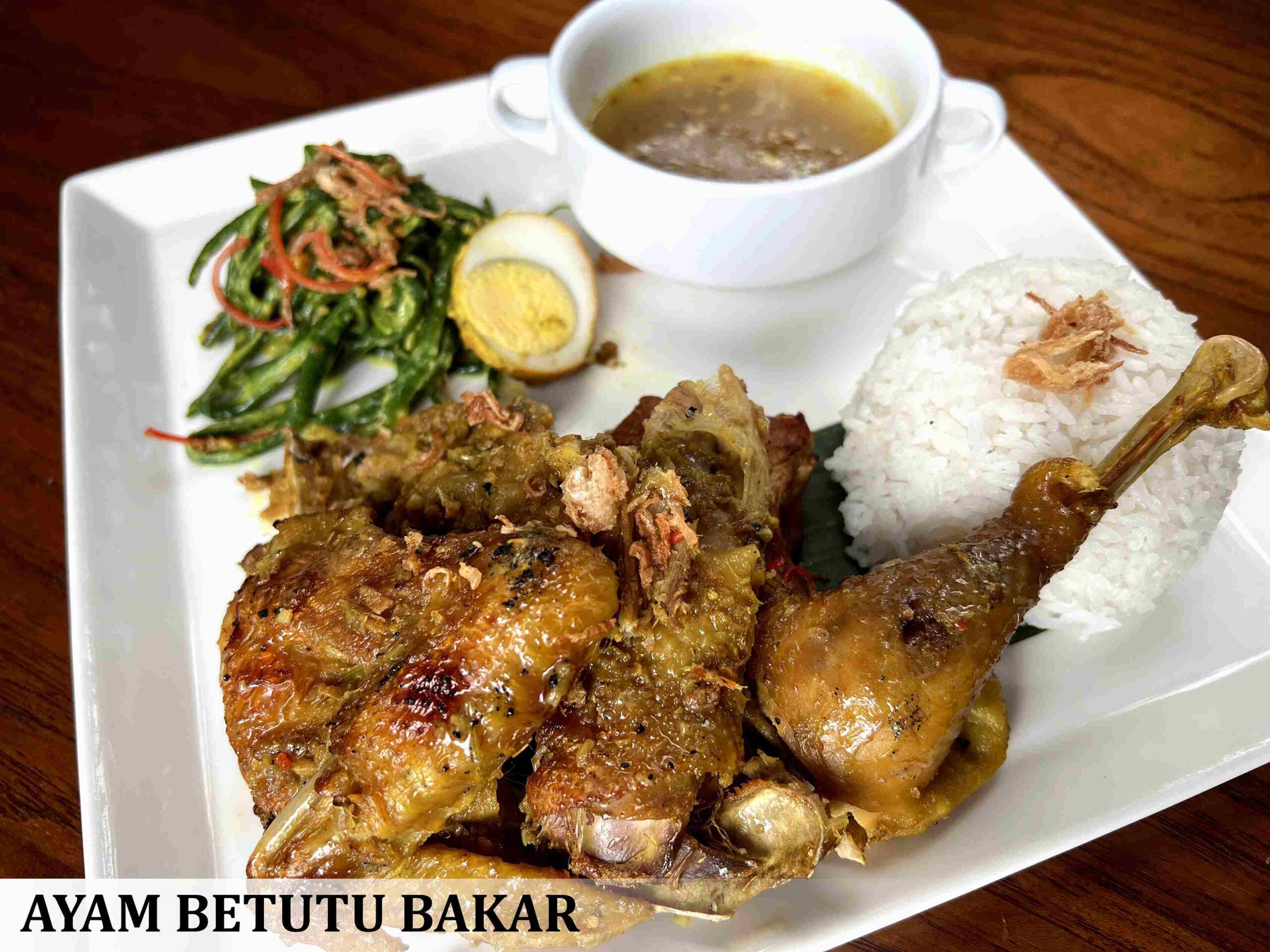 Half grilled chicken betutu with balinese mix spices, braised coconut beans, egg and sambal
