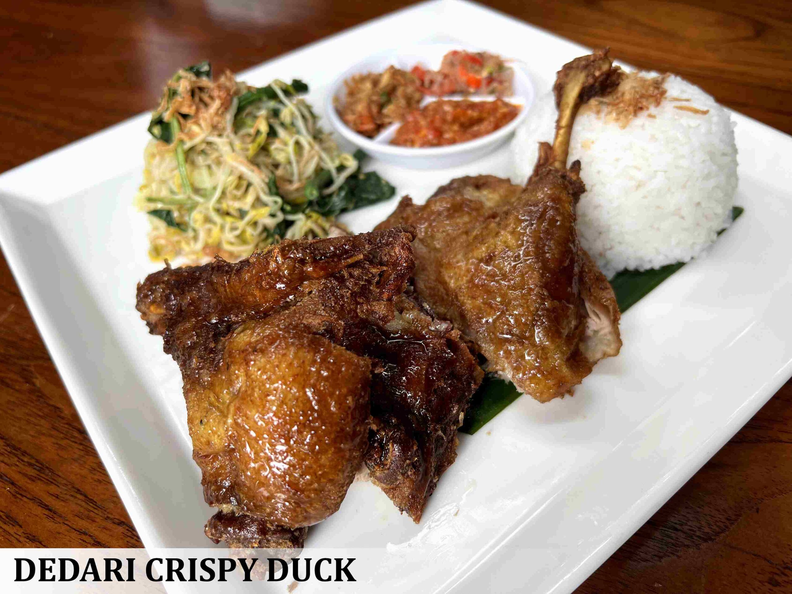 Setengah bagian bebek goreng krispi, nasi putih dan sayur urab