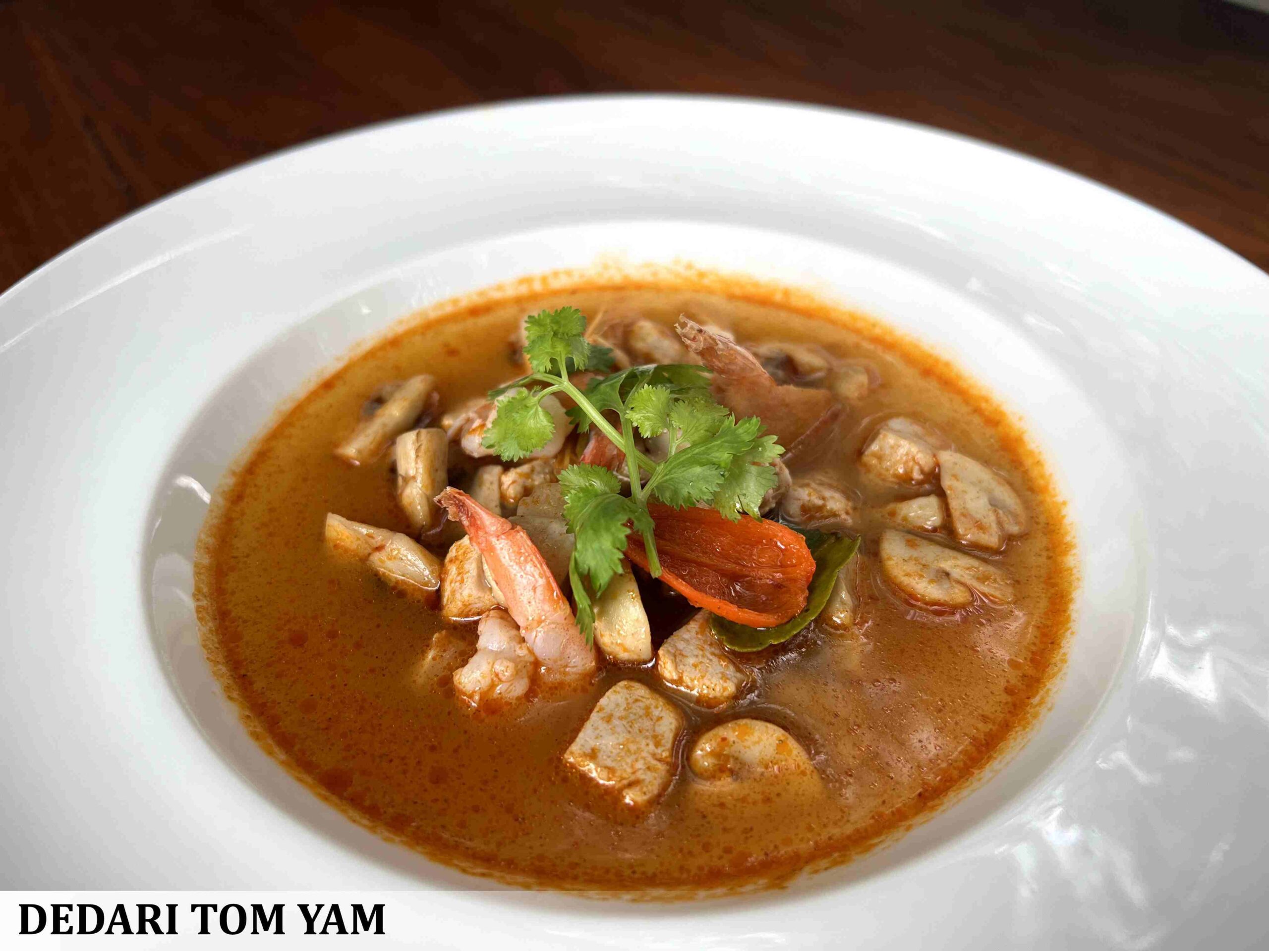 Sup seafood pedas asam segar dengan kaldu lengkuas serai, daun jeruk purut, jamur merang dan cabai