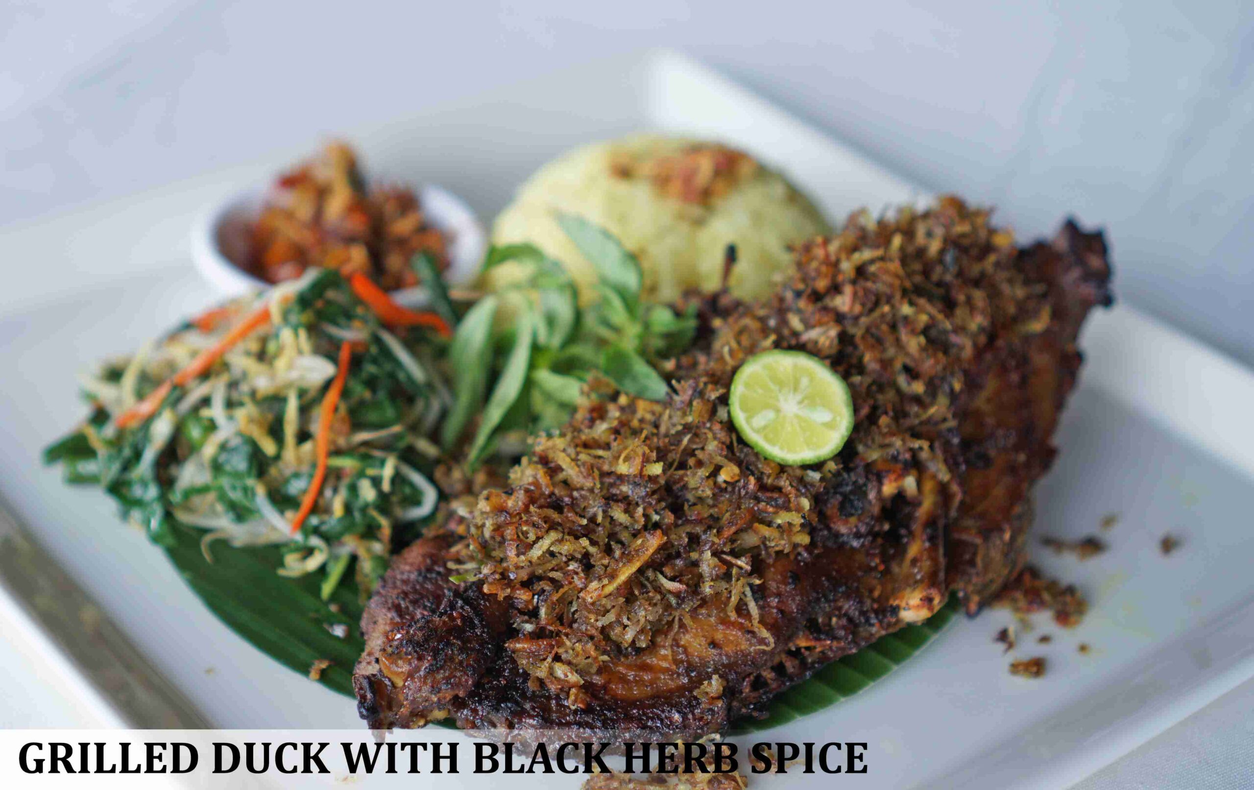 Half grilled duck with black spices, grated coconut sauce, mix balinese vegetable