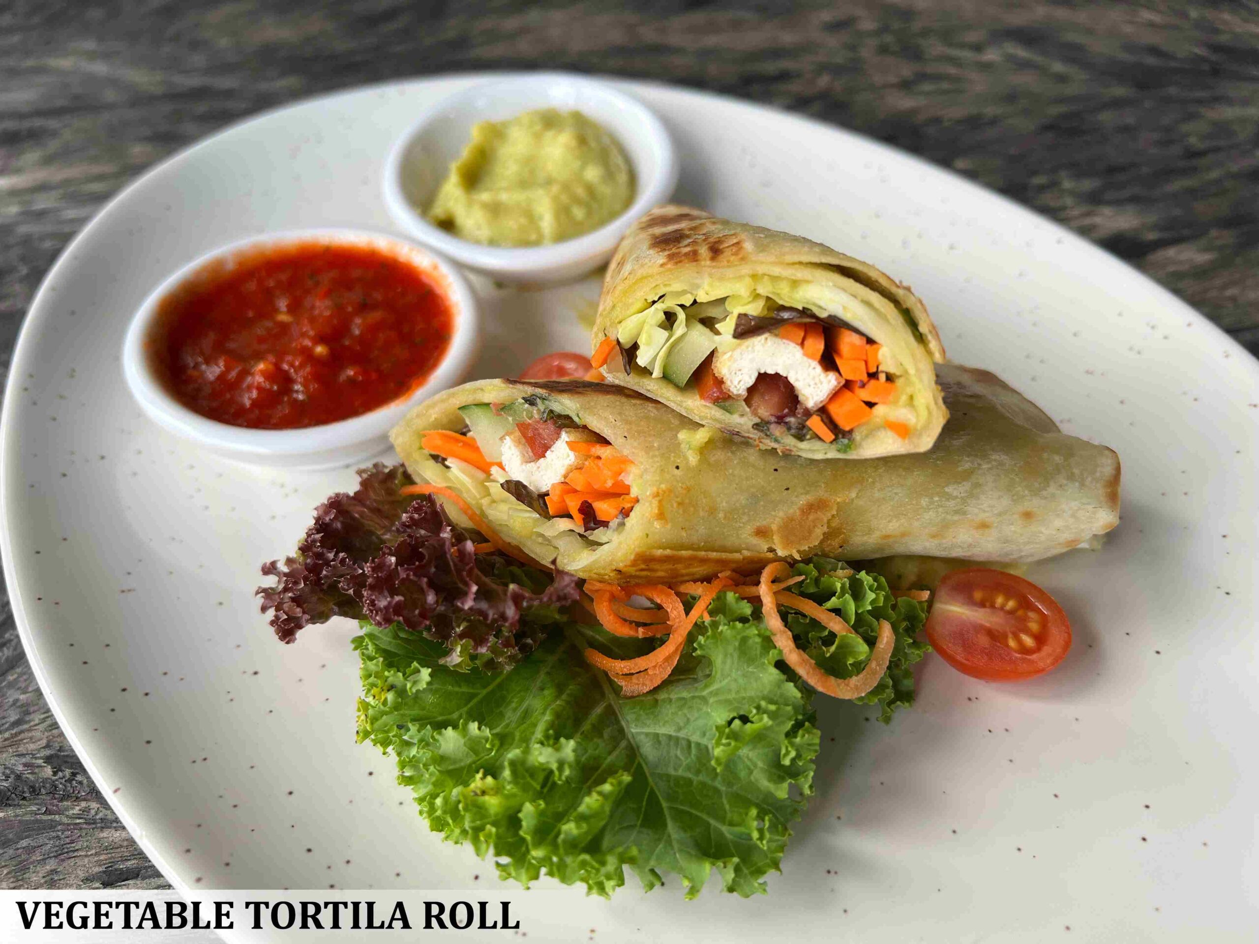 Roti isi sayur giling, tomat salsa, irisan tomat, bawang bombai